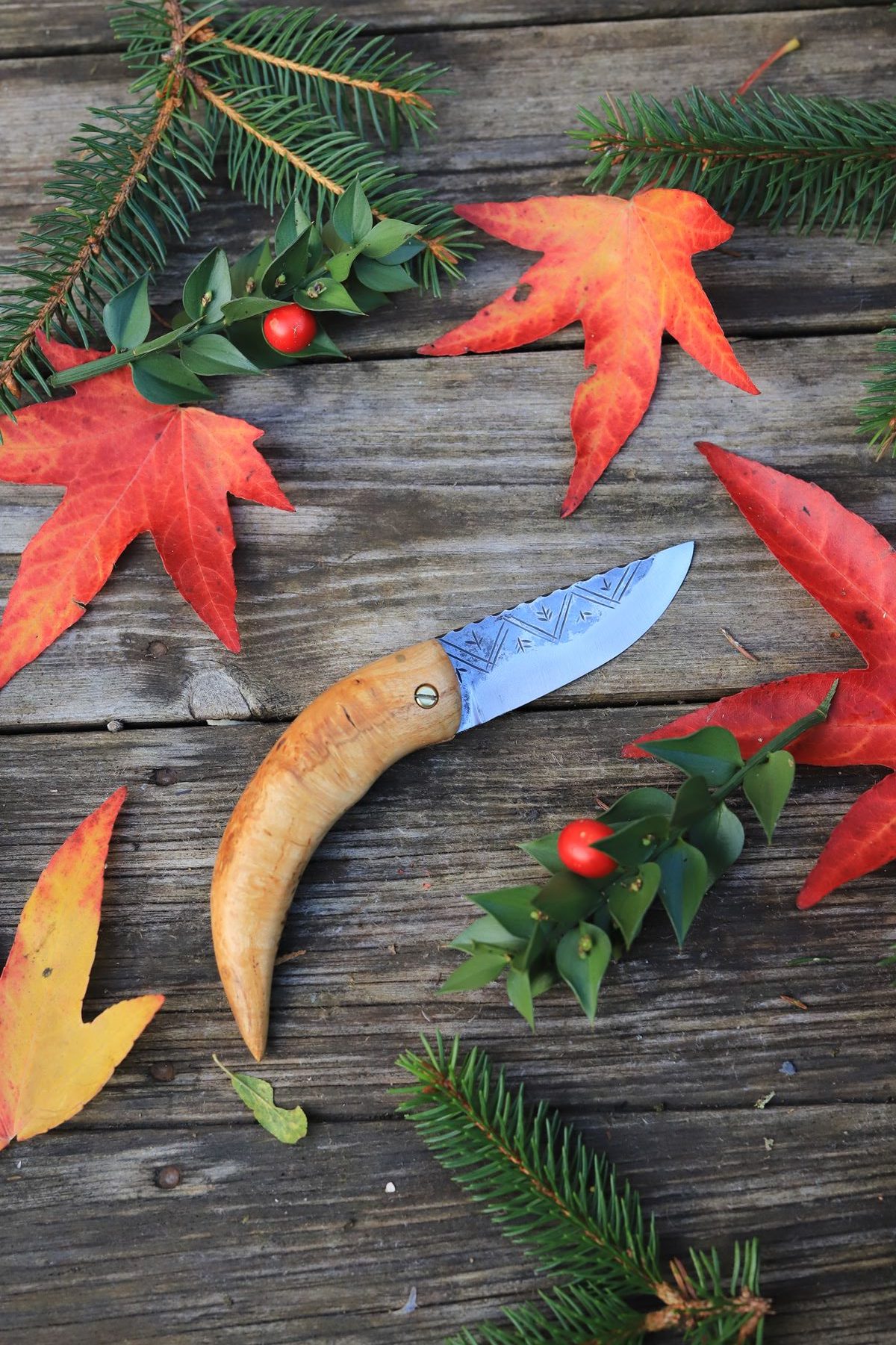 Le manche est réalisé en loupe de merisier du cotentin. C’est un couteau à lame pliante, à friction (ouverture sur une butée en laiton) : il sera parfait en randonnée, pour ramasser les champignons, etc. car il se place parfaitement dans la poche.